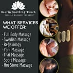 Gaerin Soothing Touch is a certified mobile massage therapist that offers all kinds of massasge services and specializes on massaging techniques to help alleviate pains, relief muscle tension and promote wellness